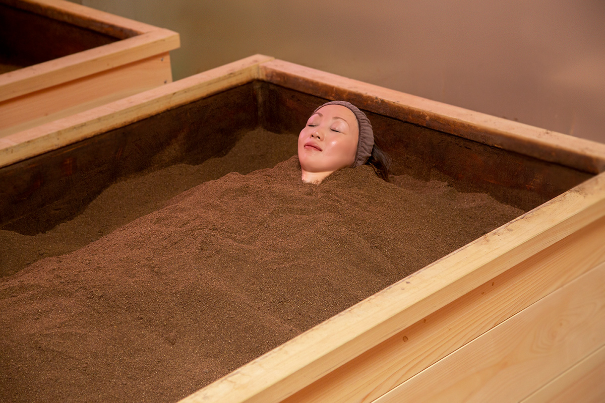 スタッフが足元から順番に全身を埋めていきます。ご希望の方は、浴衣を着たままでも入浴可能です。